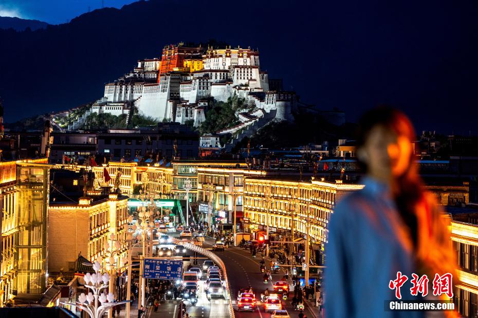 7月14日晚,在西藏拉薩,亮燈后的布達(dá)拉宮與北京東路交相輝映,夜色璀璨奪目。中新社記者 張祥毅 攝