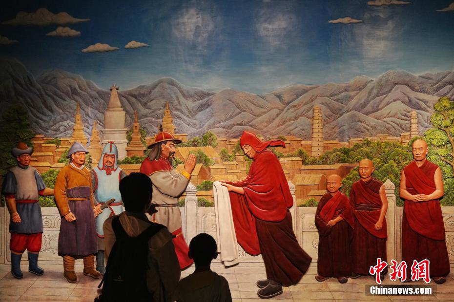 7月15日,在位于西藏拉薩的西藏博物館,觀眾參觀“涼州會談”場景,“涼州會談”結束了吐蕃地方政權對西藏的長期分治局面,順應了國家統(tǒng)一的歷史潮流。據(jù)了解,西藏博物館設有基本陳列《雪域長歌—西藏歷史文化展》《離太陽最近的人—西藏民俗文化展》,充分展示西藏地區(qū)歷史發(fā)展進程與文化面貌。中新社記者 張祥毅 攝