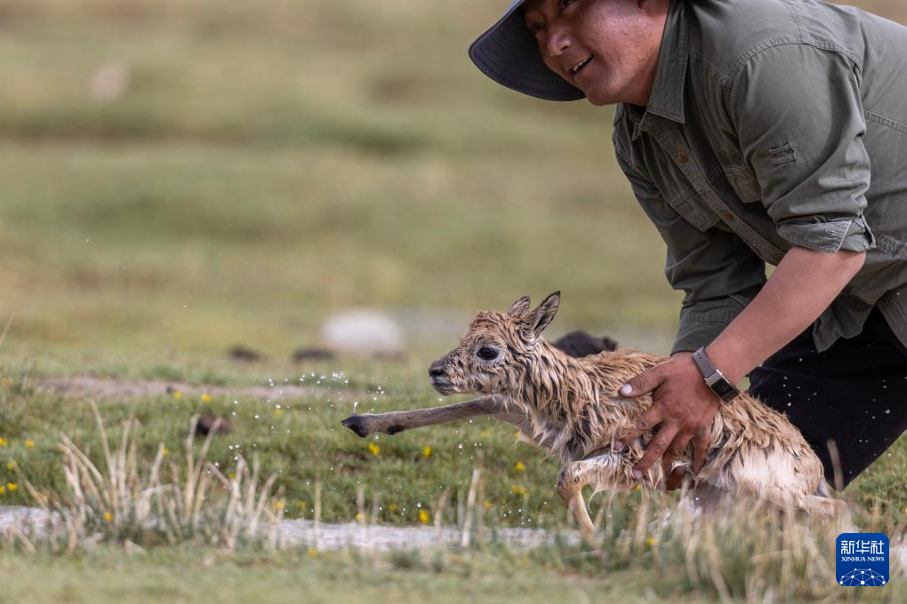 管護(hù)隊(duì)員次旺在救助一只被激流沖走的藏羚羊幼崽(7月14日攝)。新華社記者 姜帆 攝?
