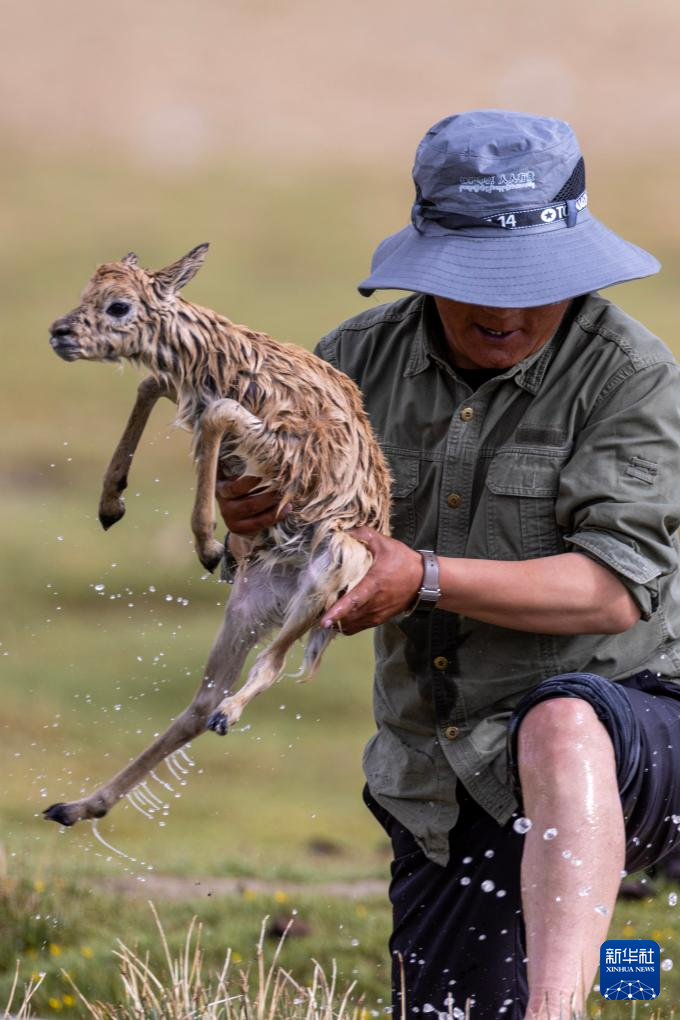 這是一只剛被管護(hù)隊(duì)員救上岸的藏羚羊幼崽(7月14日攝)。新華社記者 姜帆 攝?