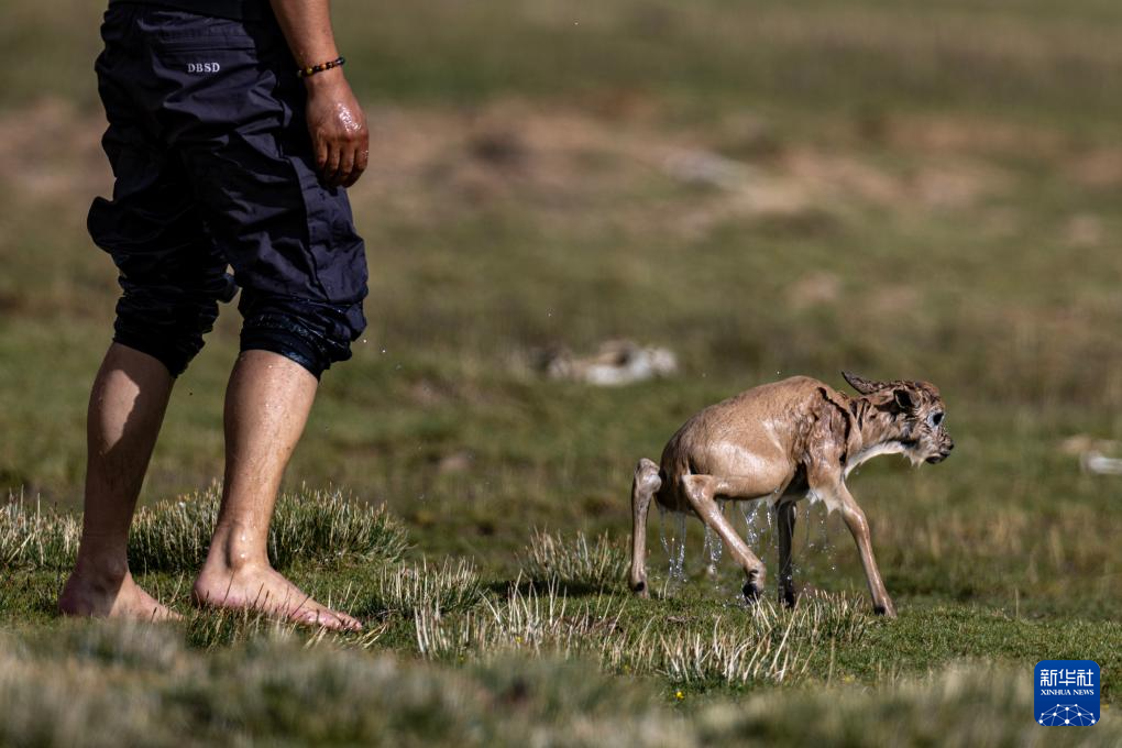 一只被激流沖走的藏羚羊幼崽被管護(hù)隊(duì)員救上岸(7月14日攝)。新華社記者 姜帆 攝??