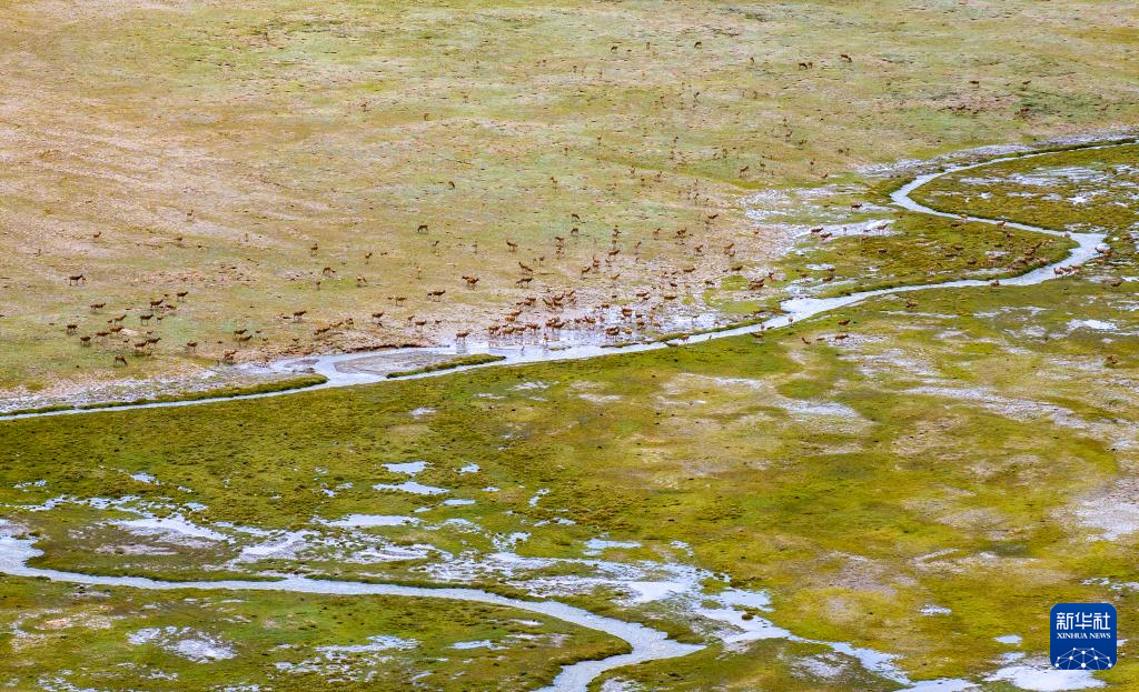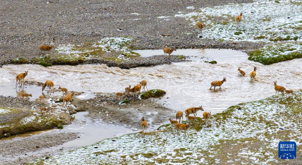 一群帶著幼崽的藏羚羊成功渡過(guò)森隆藏布河,正在往族群日常棲息地遷徙(7月16日攝)。新華社記者 姜帆 攝?