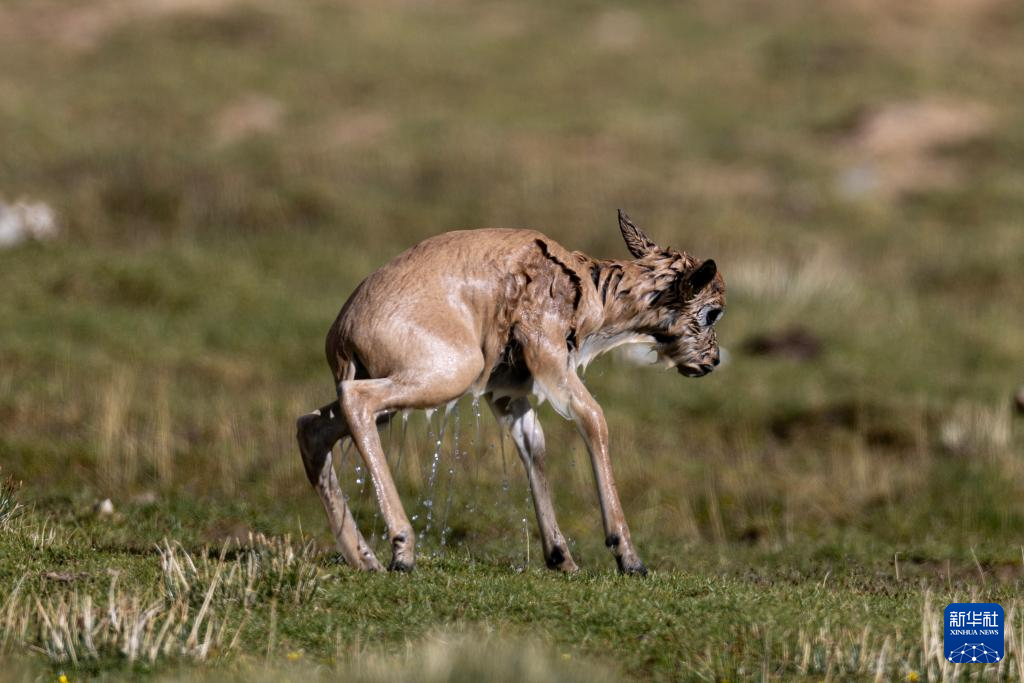 一群帶著幼崽的藏羚羊成功渡過(guò)森隆藏布河,幼崽身上水跡未干(7月15日攝)。新華社記者 姜帆 攝?