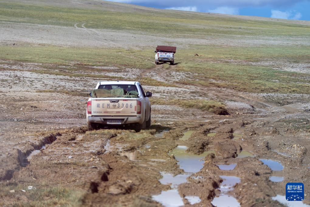 措羅木管理站的野生動(dòng)物管護(hù)員驅(qū)車(chē)前往無(wú)人區(qū)深處的森隆藏布河畔(7月14日攝)。新華社記者 姜帆 攝