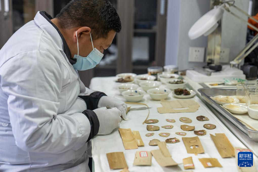 布達(dá)拉宮貝葉經(jīng)實(shí)驗(yàn)性修復(fù)小組實(shí)驗(yàn)室工作人員對(duì)貝葉進(jìn)行處理(5月25日攝)。新華社記者 李賀 攝