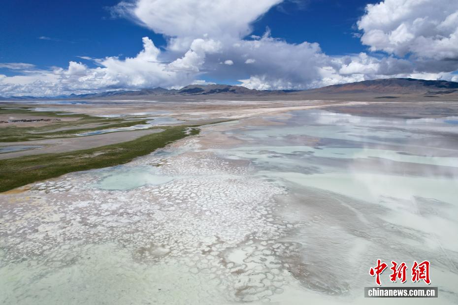 7月20日,航拍西藏阿里地區(qū)革吉縣鹽湖鄉(xiāng)境內(nèi)的鹽湖。一千多年前,阿里地區(qū)有50多家駐扎的鹽幫,將自然鹽用羊馱牛背邊放牧邊運(yùn)輸?shù)姆绞?,運(yùn)送到普蘭、日喀則、印度、尼泊爾等地,并用以物易物的方式換回青稞、磚茶、布料等日常生活所需的物品,從而孕育了遠(yuǎn)負(fù)盛名的“鹽羊古道”傳奇。近年來,當(dāng)?shù)亻_辦粗鹽巴加工廠、打造“鹽羊古道”旅游品牌等方式,使千年“鹽羊古道”煥發(fā)新生機(jī)。(無人機(jī)照片)中新社記者 張祥毅 攝
