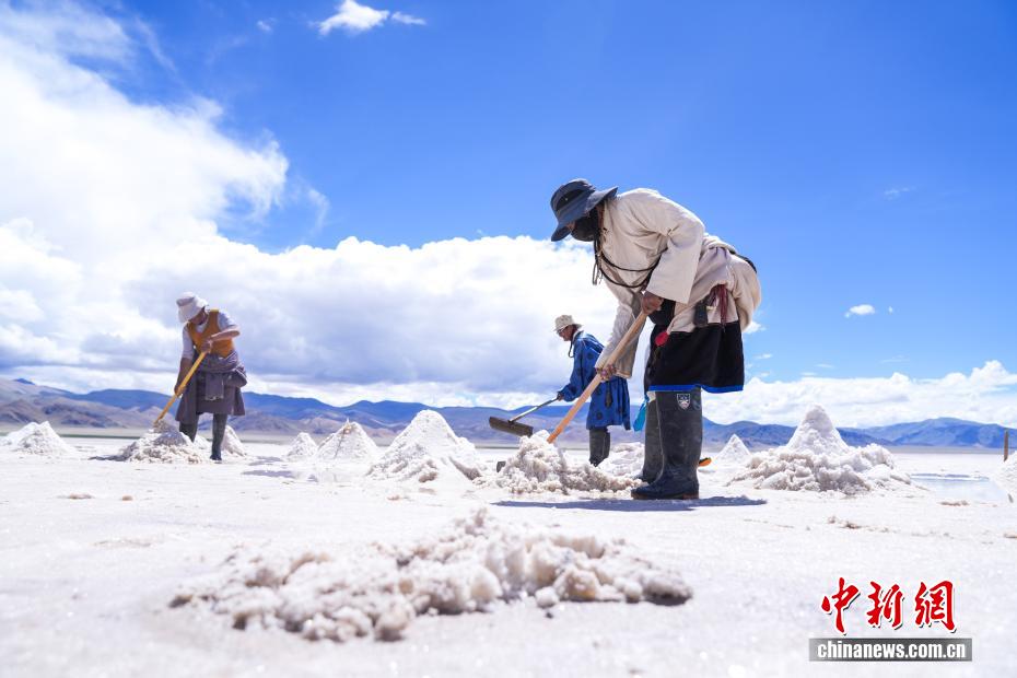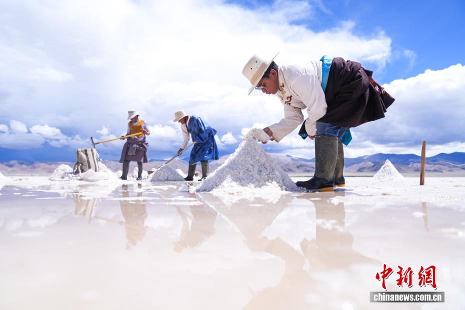 7月20日,在西藏阿里地區(qū)革吉縣鹽湖鄉(xiāng),民眾在鹽湖中采制粗鹽巴。一千多年前,阿里地區(qū)有50多家駐扎的鹽幫,將自然鹽用羊馱牛背邊放牧邊運(yùn)輸?shù)姆绞?,運(yùn)送到普蘭、日喀則、印度、尼泊爾等地,并用以物易物的方式換回青稞、磚茶、布料等日常生活所需的物品,從而孕育了遠(yuǎn)負(fù)盛名的“鹽羊古道”傳奇。近年來,當(dāng)?shù)亻_辦粗鹽巴加工廠、打造“鹽羊古道”旅游品牌等方式,使千年“鹽羊古道”煥發(fā)新生機(jī)。中新社記者 張祥毅 攝