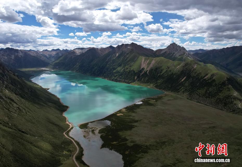 7月21日,嘉乃玉錯景色。嘉乃玉錯國家濕地公園位于西藏那曲市嘉黎縣境內(nèi)。夏日,嘉乃玉錯碧波蕩漾,湖邊綠意盎然,在藍(lán)天白云映襯下,景色如畫。(無人機(jī)照片)中新社記者 李林 攝