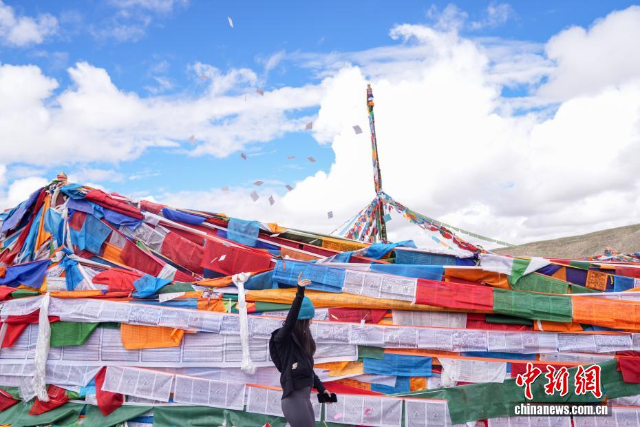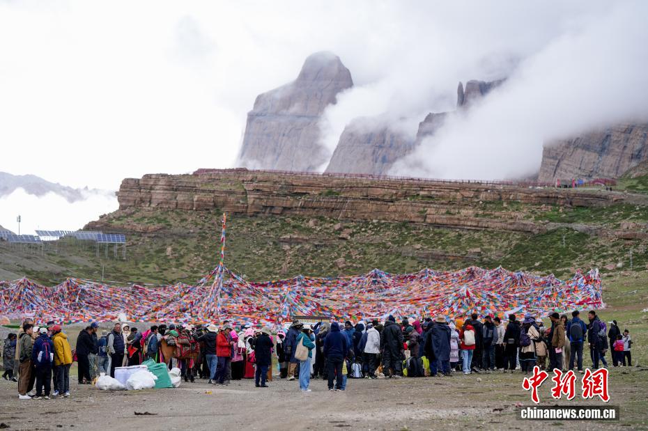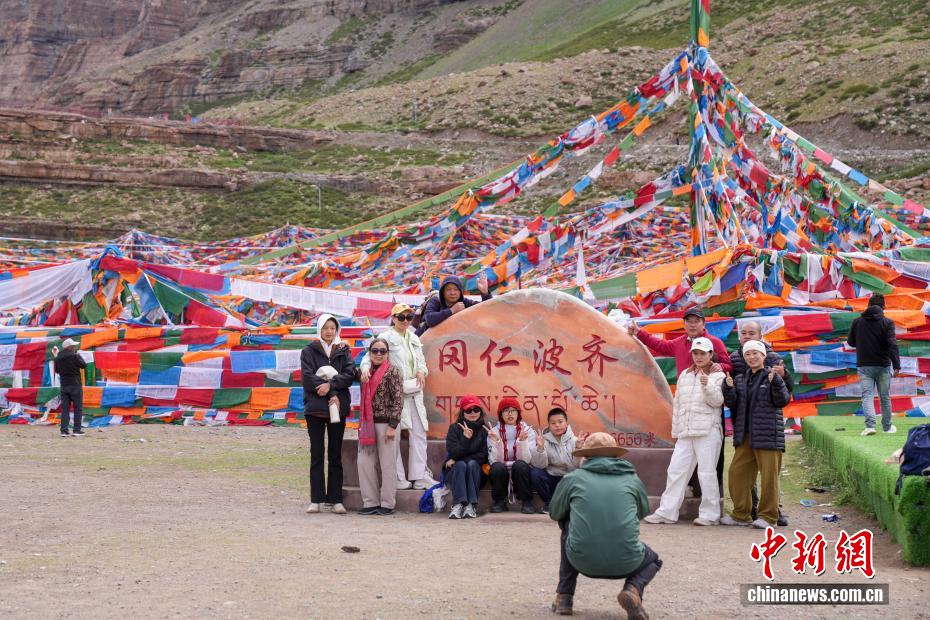 7月21日,游客在岡仁波齊山腳下的經(jīng)幡廣場(chǎng)打卡拍照。岡仁波齊位于西藏阿里地區(qū)普蘭縣境內(nèi),是岡底斯山的主峰,也是藏傳佛教的神山之一,每年吸引眾多信徒前往轉(zhuǎn)山,并衍生出徒步旅行的經(jīng)典路線。每年來(lái)自國(guó)內(nèi)外的徒步旅行者為當(dāng)?shù)貏?chuàng)造就業(yè)機(jī)會(huì)的同時(shí),也推動(dòng)了文旅產(chǎn)業(yè)的發(fā)展。中新社記者 張祥毅 攝