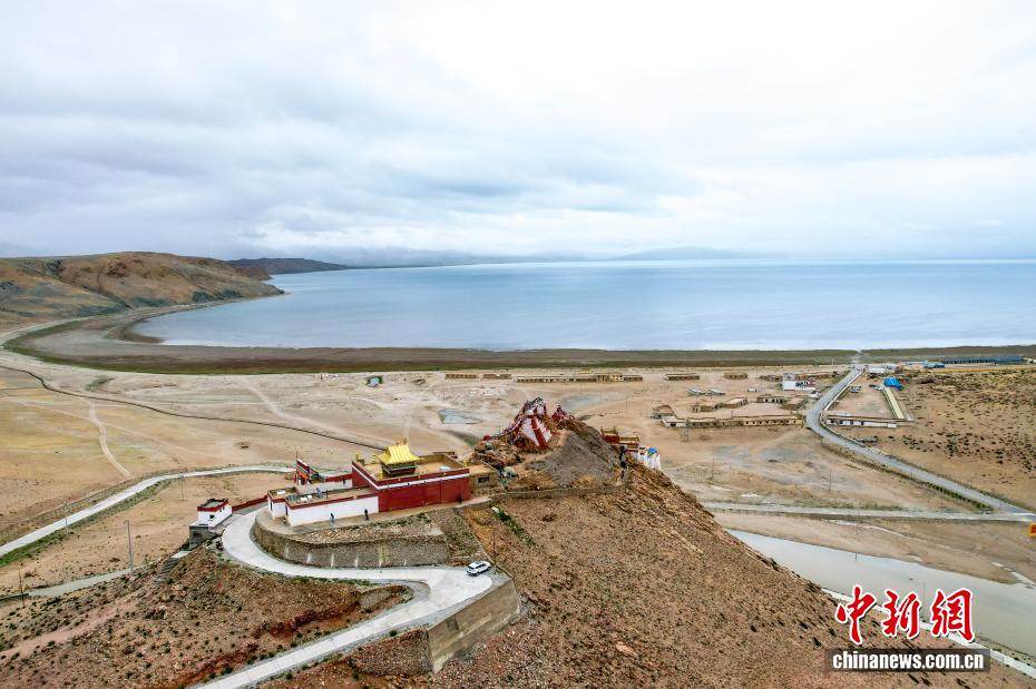 7月22日,航拍拉昂錯(cuò)夏日風(fēng)光。瑪旁雍錯(cuò)與拉昂錯(cuò)位于西藏阿里地區(qū)普蘭縣境內(nèi),兩湖僅有一堤之隔,卻擁有不同的地理特征和咸淡水之分,因而分別被譽(yù)為“圣湖”與“鬼湖”。(無(wú)人機(jī)照片)中新社記者 張祥毅 攝