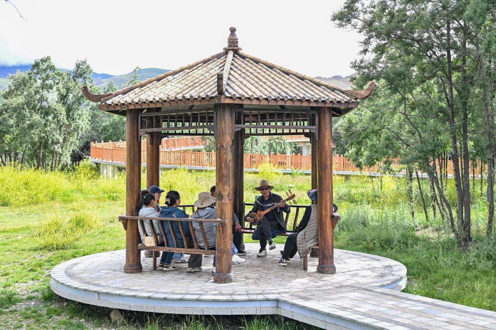 隆子縣居民在沙棘林生態(tài)公園彈奏樂器。新華社記者 李鑫 攝