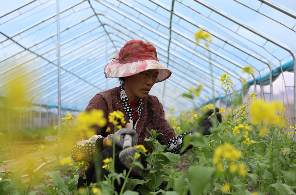 當?shù)卮迕裨诟咴教煊N基地務工。人民網(wǎng)記者 次仁羅布攝