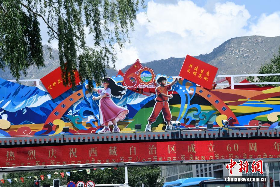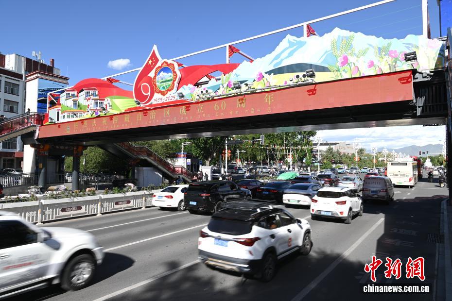 拉薩正以最美姿態(tài),迎接這一重要時刻。圖為裝扮一新的人行天橋。中新社記者 貢嘎來松 攝