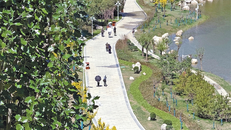 如今,湖水如碧綢般清澈,岸邊綠樹成蔭,各類花卉競相綻放。昔日雜亂之地已蛻變?yōu)榫用裥蓍e納涼的好去處。人文古跡與自然景致相映成趣,共同繪就出“百澤繞城·水城相依”的生態(tài)文明畫卷。