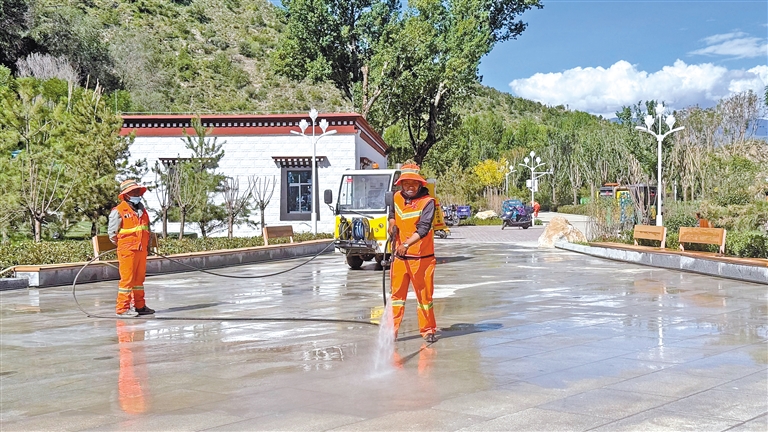 拉薩市環(huán)衛(wèi)部門工作人員保障公園干凈整潔。