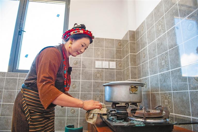 定結縣乃村村民在新房內(nèi)收拾廚房。記者 旦增嘎瓦 攝