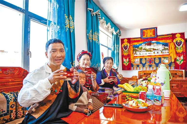 定結縣乃村村民在喝新房里的第一杯酥油茶。記者 旦增嘎瓦 攝