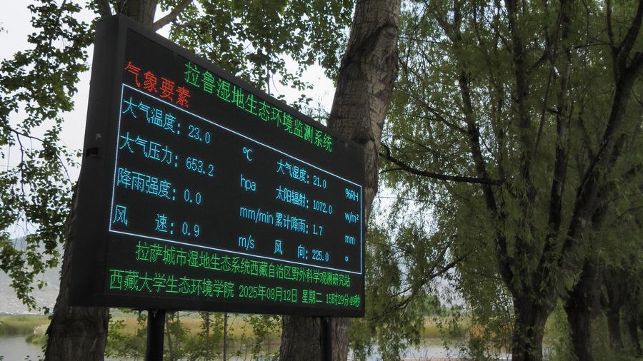 拉魯濕地國家級(jí)自然保護(hù)區(qū)南門內(nèi)的生態(tài)環(huán)境監(jiān)測系統(tǒng)顯示屏,實(shí)時(shí)顯示濕地內(nèi)的氣象要素、土壤和水環(huán)境、植被指數(shù)等數(shù)據(jù)。新華社記者 黃智琪 攝
