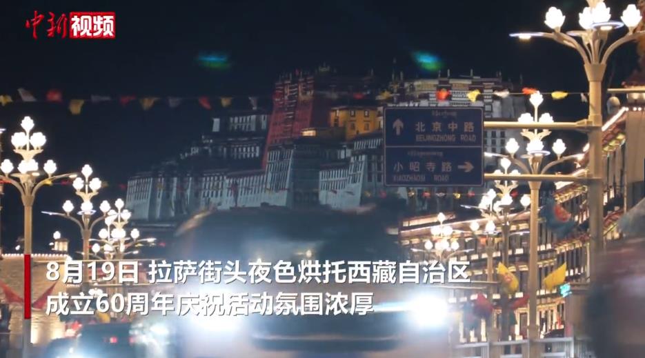 8月19日,拉薩街頭夜色烘托西藏自治區(qū)成立60周年慶?;顒臃諊鷿夂瘛kS著西藏自治區(qū)成立60周年慶祝活動臨近,拉薩街頭彩旗飄揚、人行天橋裝扮一新、燈光秀炫彩奪目,處處洋溢著一派祥和歡慶的氣氛。(李林 旦增卓瑪 制作 王嘉怡)