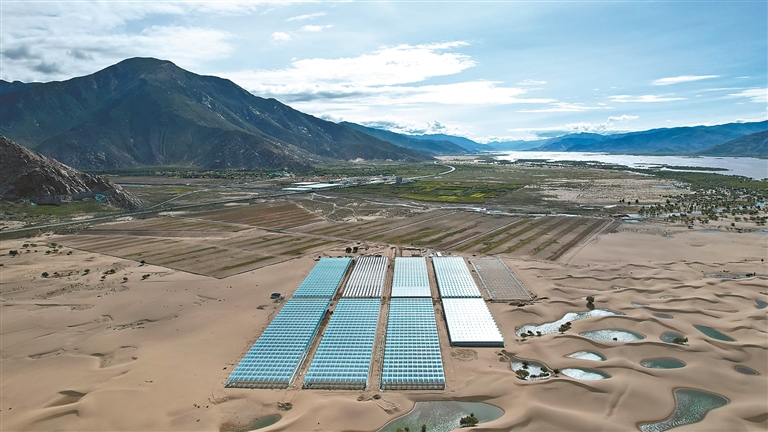 位于扎囊縣的國(guó)家農(nóng)業(yè)產(chǎn)業(yè)化示范企業(yè)——西藏綠之源現(xiàn)代農(nóng)業(yè)科技股份有限公司二期項(xiàng)目,如同一片“綠洲”鑲嵌在沙丘之中。記者 丹增平措 攝