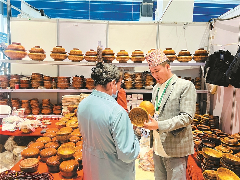 為期5天的博覽會現(xiàn)場熱鬧非凡。入口處,紅底黃字的“外貿(mào)優(yōu)品展銷”橫幅格外醒目:阿富汗商人正用不太流利的中文講解手工羊毛地毯的編織工藝;不丹展臺前,試穿傳統(tǒng)服飾的市民絡(luò)繹不絕;泰國膏藥展位的工作人員手持產(chǎn)品說明書,耐心地向顧客介紹使用方法;印度尼西亞展臺飄來咖啡焦香與伊朗藏紅花的辛香,幾位游客正輕嗅小瓷勺中的藏紅花;一旁的巴基斯坦玉石展臺前,觀眾正用手機拍攝玉飾的水波紋路,工作人員及時遞上放大鏡并介紹:“您看這紋路,是巴基斯坦特有的礦料形成的?!彪p語講解聲、詢價議價聲、游客贊嘆聲交織在一起,宛如一場生動的“國際市集”。