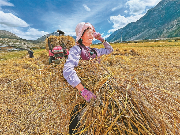 在拉薩市墨竹工卡縣唐加鄉(xiāng)莫沖村,田間地頭繁忙景象撲面而來。幾臺大型收割機(jī)轟鳴著在金色的農(nóng)田里來回穿梭,收割、脫粒一氣呵成,村民們跟在機(jī)器后方,有條不紊地進(jìn)行后續(xù)整理工作,呈現(xiàn)出一派熱火朝天的豐收場景。村民貢嘎頓玉向記者介紹,“我家共有37畝農(nóng)田,10畝種小油菜,27畝種青稞。以前全家4口上陣得忙上一個多月,現(xiàn)在有了機(jī)械化作業(yè),短短幾天就能完成所有秋收工作,既省時又省力?!?/p>