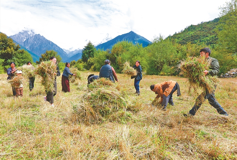 林芝市工布江達(dá)縣錯高鄉(xiāng)結(jié)巴村村民秋收場景。記者 白瑪澤旺 次仁平措 攝