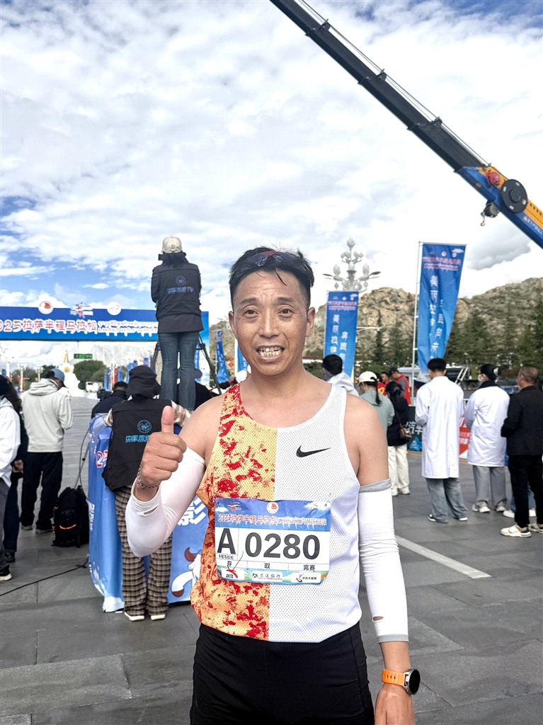 “跑拉薩半馬,可不只是跑21.0975公里,更像是跑過(guò)一段活著的歷史?!?5歲的田剛在賽前踩線(xiàn)時(shí),特意放慢腳步,對(duì)著布達(dá)拉宮的方向拍下照片。作為拉薩半程馬拉松的忠實(shí)粉絲,為了趕上2025年的賽事,他從貴州興義出發(fā),每天騎摩托車(chē)疾馳500多公里,6天跨越黔、川、藏三?。▍^(qū)),在海拔3650米的“日光城”兌現(xiàn)與奔跑的約定。他拍了拍頭盔,黝黑的臉上滿(mǎn)是興奮:“我跑過(guò)國(guó)內(nèi)多場(chǎng)馬拉松,卻唯獨(dú)對(duì)拉薩半馬格外執(zhí)著。”