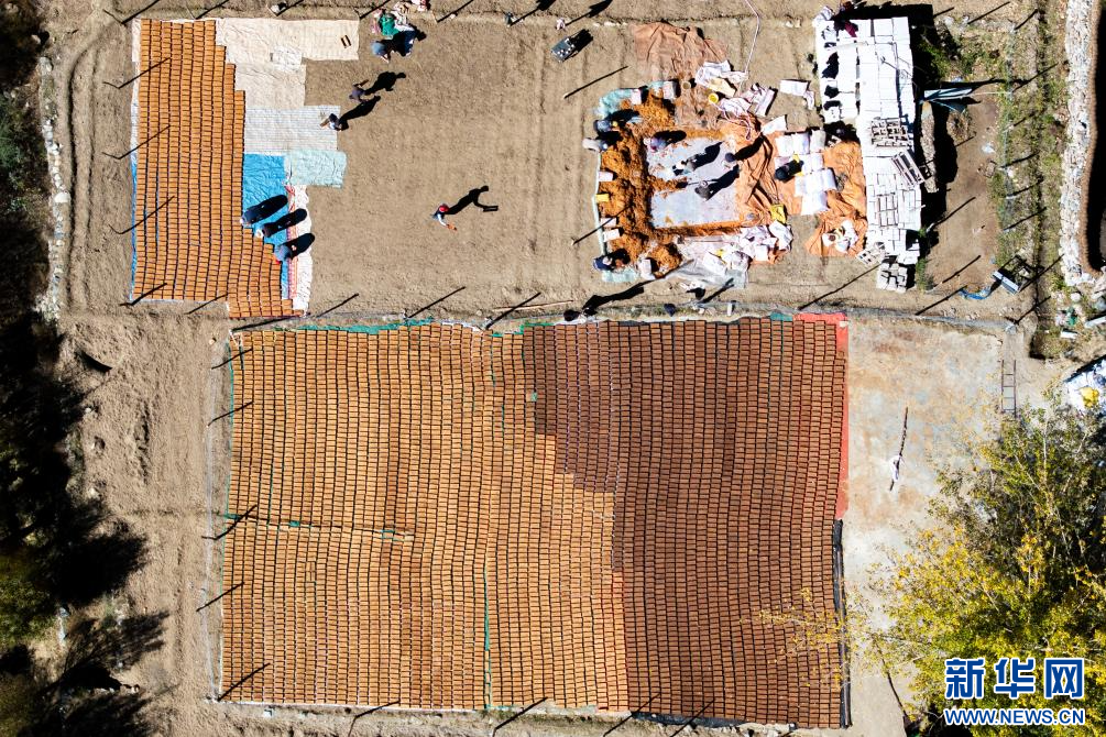 10月17日,西藏拉薩市尼木縣吞巴鎮(zhèn)吞達(dá)村村民把經(jīng)過水磨后的柏木漿制作成香磚(無人機(jī)照片)。新華網(wǎng) 旦增努布 攝