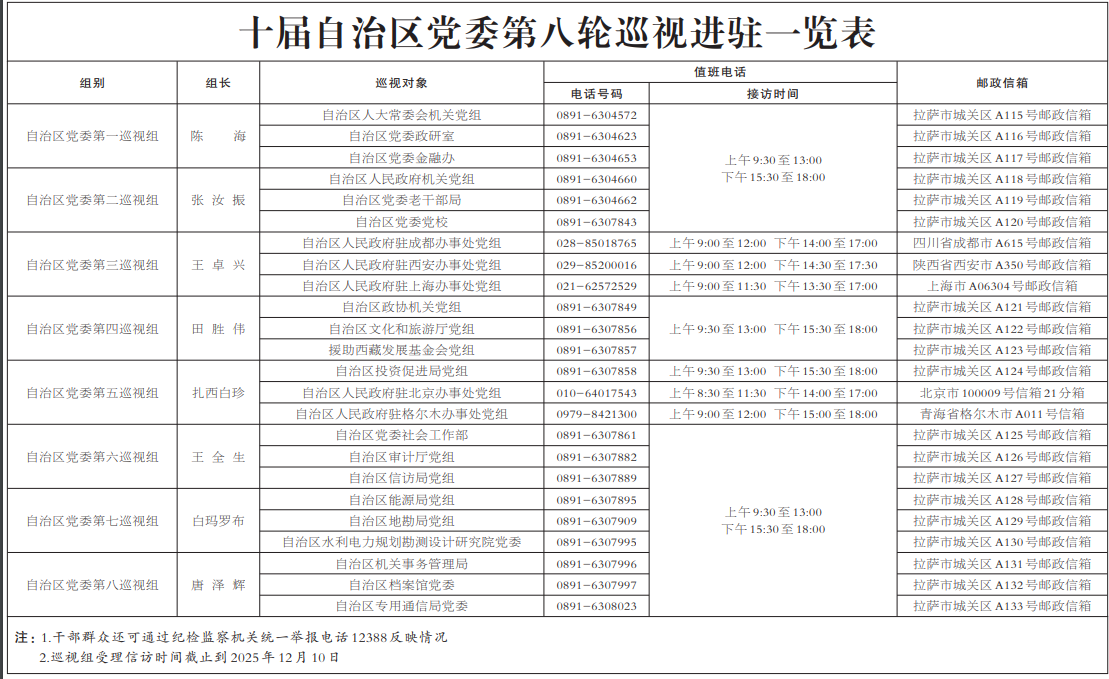 根據(jù)自治區(qū)黨委關(guān)于巡視工作的統(tǒng)一部署,截至10月24日,十屆自治區(qū)黨委第八輪巡視完成進駐工作。自治區(qū)黨委巡視組將對自治區(qū)人大常委會機關(guān)、政府機關(guān)、政協(xié)機關(guān),自治區(qū)黨委社會工作部、政研室、金融辦、老干部局、機關(guān)事務(wù)管理局、黨校,自治區(qū)審計廳、信訪局、能源局、投資促進局、地勘局、檔案館、專用通信局、水利電力規(guī)劃勘測設(shè)計研究院,自治區(qū)人民政府駐北京辦事處、駐成都辦事處、駐西安辦事處、駐上海辦事處、駐格爾木辦事處,援助西藏發(fā)展基金會等23個區(qū)直單位黨組織開展常規(guī)巡視;對自治區(qū)文化和旅游廳黨組開展巡視“回頭看”。