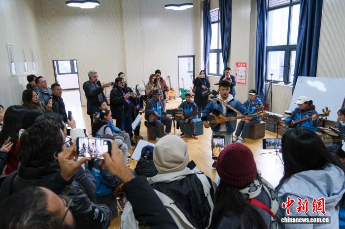 10月28日,拉美18個(gè)國家的21名記者、編輯等媒體從業(yè)者在西藏自治區(qū)林芝市巴宜區(qū)中學(xué)參訪,觀看師生們演奏藏族扎念琴。中新社記者 江飛波 攝