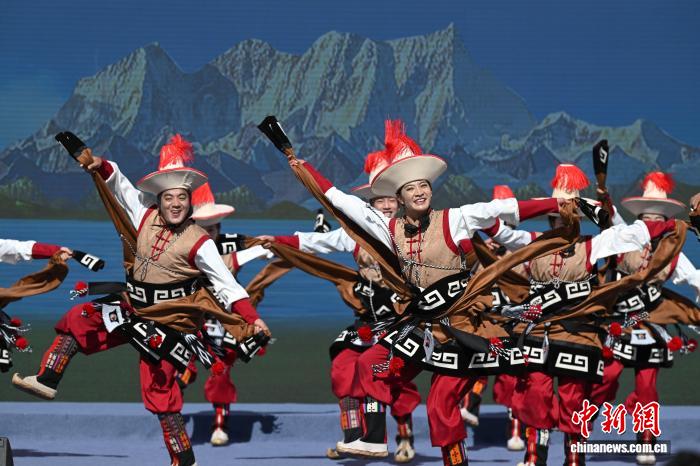 圖為阿里地區(qū)改則縣藝術(shù)團(tuán)表演舞蹈《歡舞幸?!じ膭t情》。中新社記者 貢嘎來松 攝