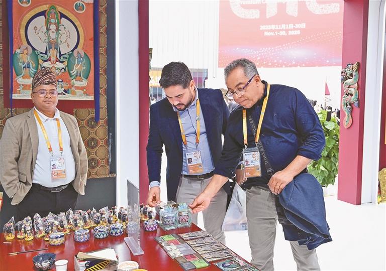 圖為第八屆中國(guó)國(guó)際進(jìn)口博覽會(huì)西藏館內(nèi)的客人在選購(gòu)商品。記者 王敏 索朗瓊珠 嘎松卓瑪 攝影報(bào)道