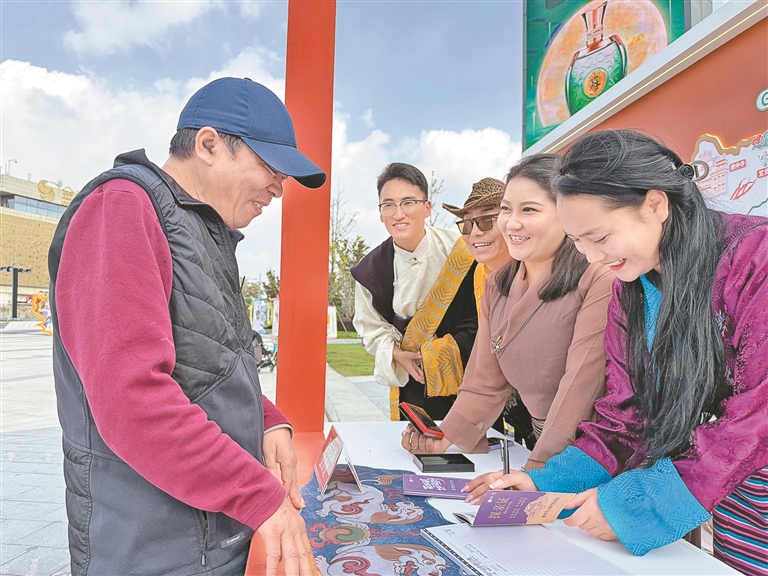 “萬人墨竹探親游”活動(dòng)的探親證發(fā)放處人潮擁擠,排隊(duì)申請(qǐng)領(lǐng)證的市民絡(luò)繹不絕。“我們準(zhǔn)備了1萬本免費(fèi)發(fā)放的探親證,探親證上詳細(xì)介紹了紅色文化游、藍(lán)色康養(yǎng)游、綠色生態(tài)游、文化探秘游、墨竹深度游精品線路的詳細(xì)內(nèi)容供大家選擇。屆時(shí),我們將準(zhǔn)備好香甜的青稞酒、潔白的哈達(dá)、美味的藏餐等候咱們南京的兄弟姐妹回雪域高原的墨竹家中看看、坐坐?!蹦窆たh文化旅游公司負(fù)責(zé)人扎西措姆在探親證發(fā)放現(xiàn)場介紹道。