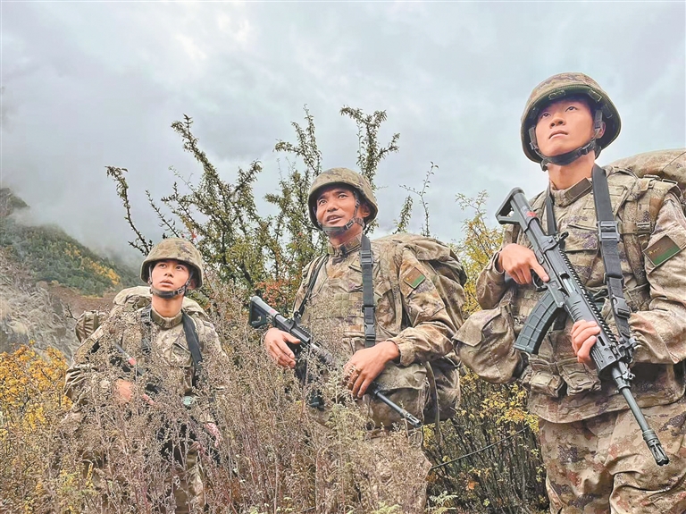 2025年11月,西藏軍區(qū)某團(tuán)一級(jí)上士次羅布(中)和戰(zhàn)友們?cè)谘策壨局杏^察前方路況。記者 丹增平措 攝