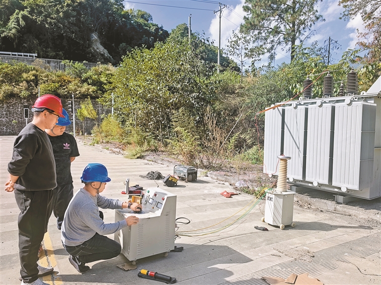 圖為國網(wǎng)察隅縣供電公司工作人員正在對變壓器進行試驗調試。
