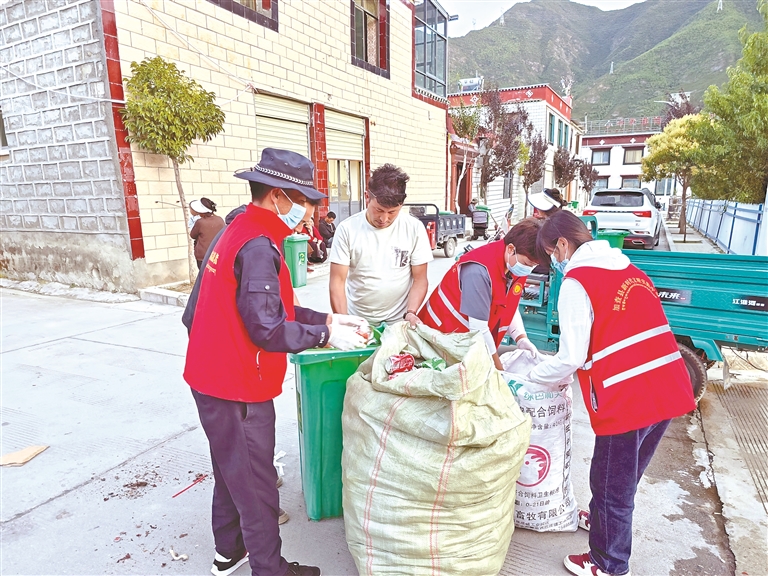 圖為塘麥村黨員在幫助村民搬運可回收垃圾。記者 武沛濤 丹增平措 攝