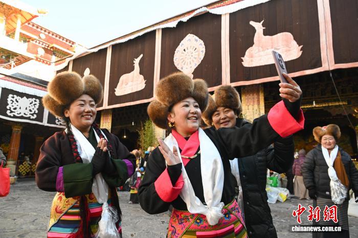 隨著藏歷十月十五白拉姆節(jié)(又稱“仙女節(jié)”)臨近,11月28日,西藏拉薩的婦女們?cè)诖笳阉绿陚鹘y(tǒng)舞蹈后自拍留念,迎接“仙女節(jié)”到來(lái)?!跋膳?jié)”即吉祥天母節(jié),藏語(yǔ)稱“白來(lái)日追”。相傳藏傳佛教最高護(hù)法神之一班丹拉姆的女兒白拉姆,不顧母親的反對(duì)與赤尊贊私定終身,班丹拉姆一怒之下將赤尊贊趕到拉薩河南岸,規(guī)定二人僅每年的藏歷十月十五日相見。中新社記者 貢嘎來(lái)松 攝