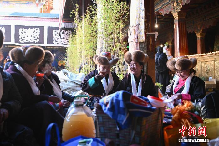隨著藏歷十月十五白拉姆節(jié)(又稱“仙女節(jié)”)臨近,11月28日,西藏拉薩的婦女們?cè)诖笳阉绿陚鹘y(tǒng)舞蹈后休息,迎接“仙女節(jié)”到來(lái)?!跋膳?jié)”即吉祥天母節(jié),藏語(yǔ)稱“白來(lái)日追”。相傳藏傳佛教最高護(hù)法神之一班丹拉姆的女兒白拉姆,不顧母親的反對(duì)與赤尊贊私定終身,班丹拉姆一怒之下將赤尊贊趕到拉薩河南岸,規(guī)定二人僅每年的藏歷十月十五日相見。中新社記者 貢嘎來(lái)松 攝