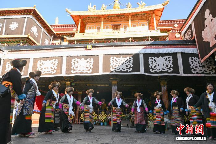 隨著藏歷十月十五白拉姆節(jié)(又稱“仙女節(jié)”)臨近,11月28日,西藏拉薩的婦女們?cè)诖笳阉绿饌鹘y(tǒng)舞蹈,迎接“仙女節(jié)”到來(lái)?!跋膳?jié)”即吉祥天母節(jié),藏語(yǔ)稱“白來(lái)日追”。相傳藏傳佛教最高護(hù)法神之一班丹拉姆的女兒白拉姆,不顧母親的反對(duì)與赤尊贊私定終身,班丹拉姆一怒之下將赤尊贊趕到拉薩河南岸,規(guī)定二人僅每年的藏歷十月十五日相見。中新社記者 貢嘎來(lái)松 攝