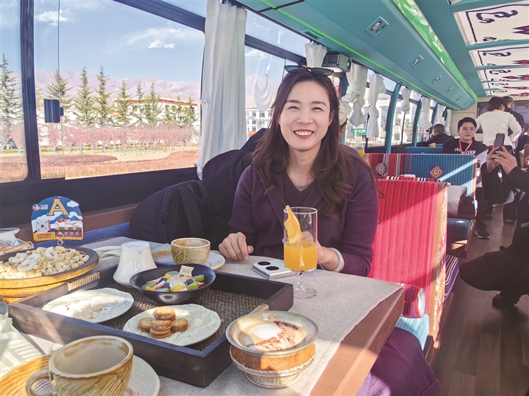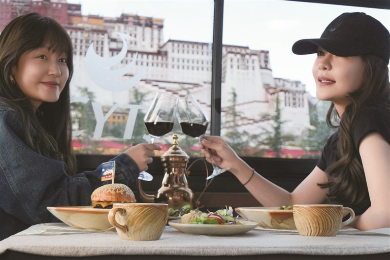 為了讓游客和市民能夠品嘗到最地道的拉薩美食,觀光巴士運營方與拉薩多家知名餐廳展開了深度合作。乘車期間,游客可以圍爐煮茶,感受那份溫馨與愜意,品嘗果茶的清甜、干果的香脆與甜品的綿密交織在口中的美妙滋味;還可以喝上一杯用高原牦牛奶與醇厚紅茶小火慢熬而成的甜茶,搭配上融合藏式元素的精致茶點,仿佛瞬間穿越到了拉薩當?shù)厝说纳钪?,沉浸式體驗他們的悠閑午后時光。