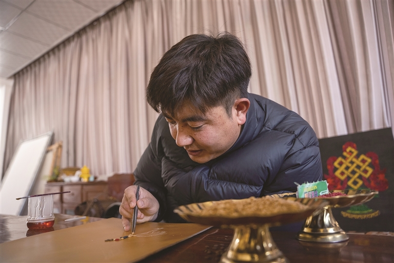 如今,仁青多吉依然在唐卡繪制與青稞文創(chuàng)之間忙碌著。陽(yáng)光掠過他剛完成的一幅作品,黑頸鶴的棕褐色喙部、漸變棕灰的羽翼在光影下栩栩如生,一粒粒青稞如同被賦予了生命,靜靜訴說(shuō)著林周的生態(tài)與農(nóng)耕故事。工作室里,畫師們偶爾會(huì)停下手中的筆,圍過來(lái)看他的創(chuàng)作進(jìn)度,時(shí)不時(shí)交流幾句,歡聲笑語(yǔ)間,傳統(tǒng)技藝的火種在默契中傳遞。