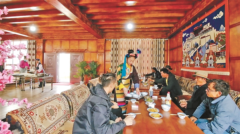 作為自治區(qū)級(jí)非遺傳承人、芒康縣“婦女致富帶頭人”的卓瑪拉姆,于2010年開辦鹽井果拉叢農(nóng)家樂,憑借著正宗的加加面風(fēng)味和熱情的服務(wù),逐漸積累了口碑。2012年,在各級(jí)政府的支持下,她采用“民族特色餐飲+鄉(xiāng)村旅游接待”的經(jīng)營(yíng)模式,生意日益紅火。2017年,通過貸款300萬(wàn)元、自籌160萬(wàn)元翻建了農(nóng)家樂,將其升級(jí)為綜合型的民族特色餐飲店,經(jīng)營(yíng)規(guī)模大幅擴(kuò)大,最多時(shí)日接待游客達(dá)300余人。