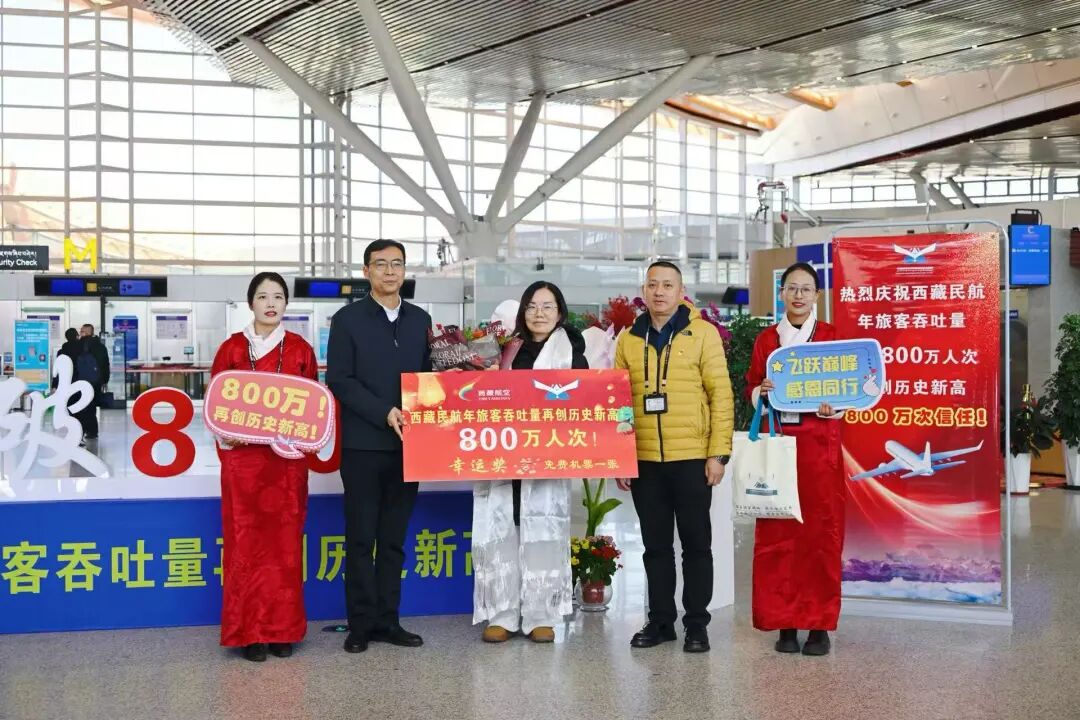圖為當(dāng)天在拉薩貢嘎國(guó)際機(jī)場(chǎng)抽取了第800萬(wàn)名的幸運(yùn)旅客與工作人員合影