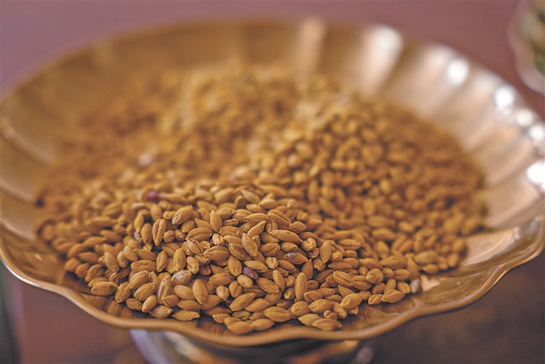 清洗后曬干上色的青稞,用于制作青稞文創(chuàng)產(chǎn)品。