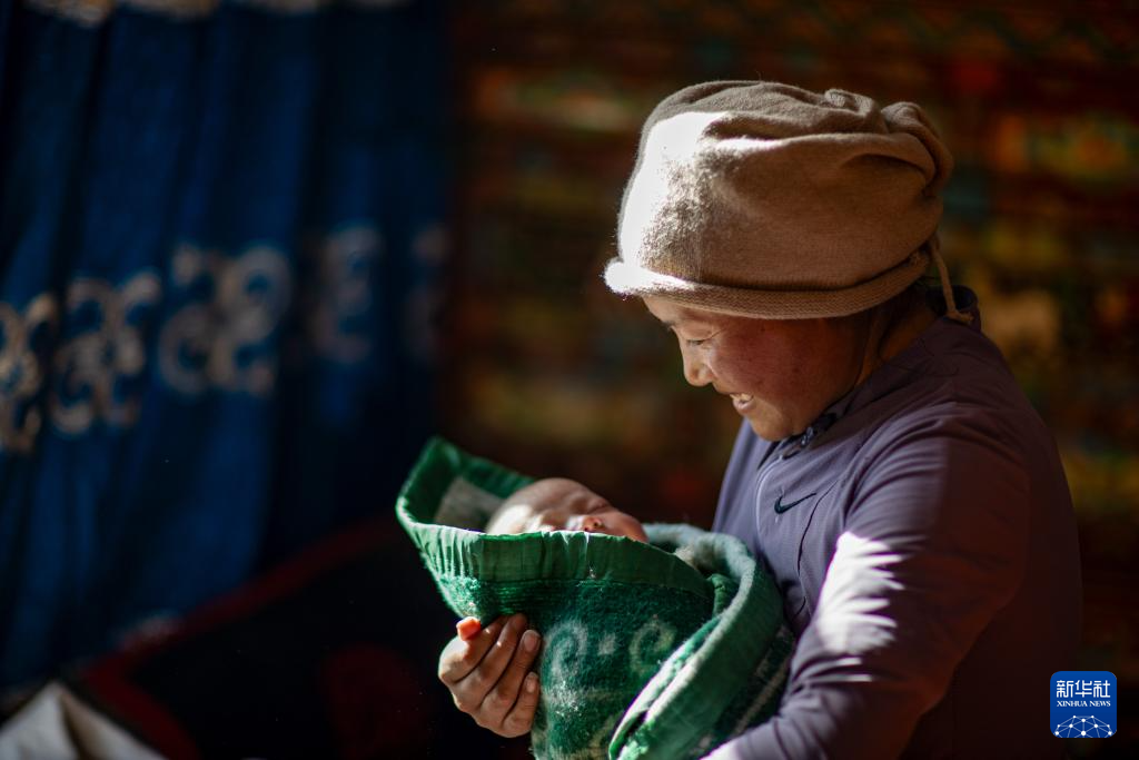 2025年1月8日,次仁拉姆抱著自己剛滿月的孩子格桑巴宗。新華社記者 姜帆 攝