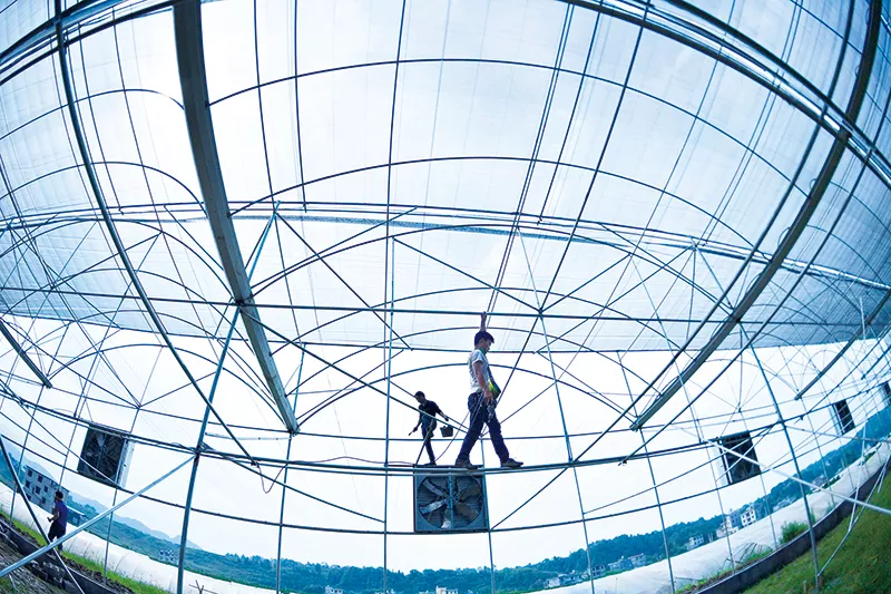 近年來(lái),湖北省恩施土家族苗族自治州宣恩縣大力發(fā)展“設(shè)施農(nóng)業(yè)”,通過(guò)企業(yè)、合作社、家庭農(nóng)場(chǎng)等將農(nóng)民手中的土地進(jìn)行流轉(zhuǎn),發(fā)展農(nóng)業(yè)觀(guān)光園和生態(tài)采摘園,為當(dāng)?shù)剞r(nóng)民開(kāi)辟一條產(chǎn)業(yè)脫貧的新路。圖為宣恩縣李家河鎮(zhèn)二虎寨村,工人們?cè)诖罱乜卮笈铩?新華社記者 宋文/攝