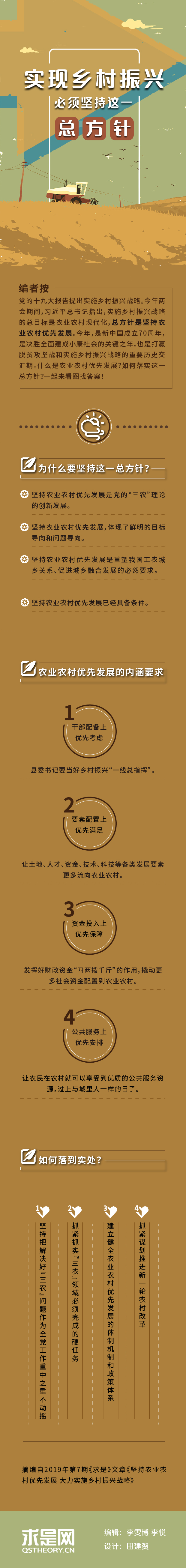 編者按:黨的十九大報告提出實施鄉(xiāng)村振興戰(zhàn)略。今年兩會期間,習近平總書記指出,實施鄉(xiāng)村振興戰(zhàn)略的總目標是農(nóng)業(yè)農(nóng)村現(xiàn)代化,總方針是堅持農(nóng)業(yè)農(nóng)村優(yōu)先發(fā)展。今年,是新中國成立70周年,是決勝全面建成小康社會的關(guān)鍵之年,也是打贏脫貧攻堅戰(zhàn)和實施鄉(xiāng)村振興戰(zhàn)略的重要歷史交匯期。什么是農(nóng)業(yè)農(nóng)村優(yōu)先發(fā)展?如何落實這一總方針?一起來看圖找答案!