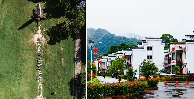 2018年7月29日,瑞金市率先在贛南脫貧摘帽,“共和國搖籃”在全面建成小康社會道路上邁出關鍵一步。左圖為2018年7月21日拍攝的江西瑞金市紅軍烈士紀念塔的鳥瞰圖(黃龍/攝)。右圖為2019年5月6日拍攝的華屋村新貌(新華社記者 蘭紅光/攝)。華屋村位于江西瑞金市葉坪鄉(xiāng),是遠近聞名的“紅軍村”。
