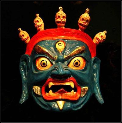 面具,藏語中稱“巴”,主要用于各種民間表演活動(dòng),它與人們?nèi)粘I?、勞?dòng)、娛樂有著直接的關(guān)系,遍及全區(qū)各地。西藏面具大致分為差姆(跳神)面具、藏戲面具、懸掛面具三類。面具的制作材料有金質(zhì)、皮質(zhì)、祭品、木質(zhì)、紙質(zhì)、泥質(zhì)、貼布脫胎等。由于地域的差異、用途的不同,西藏面具呈現(xiàn)出多姿多彩、對(duì)比強(qiáng)烈、形式各異的特點(diǎn)。